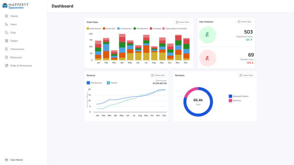 - Quick stats on pending approvals, active projects, and completed deliveries.